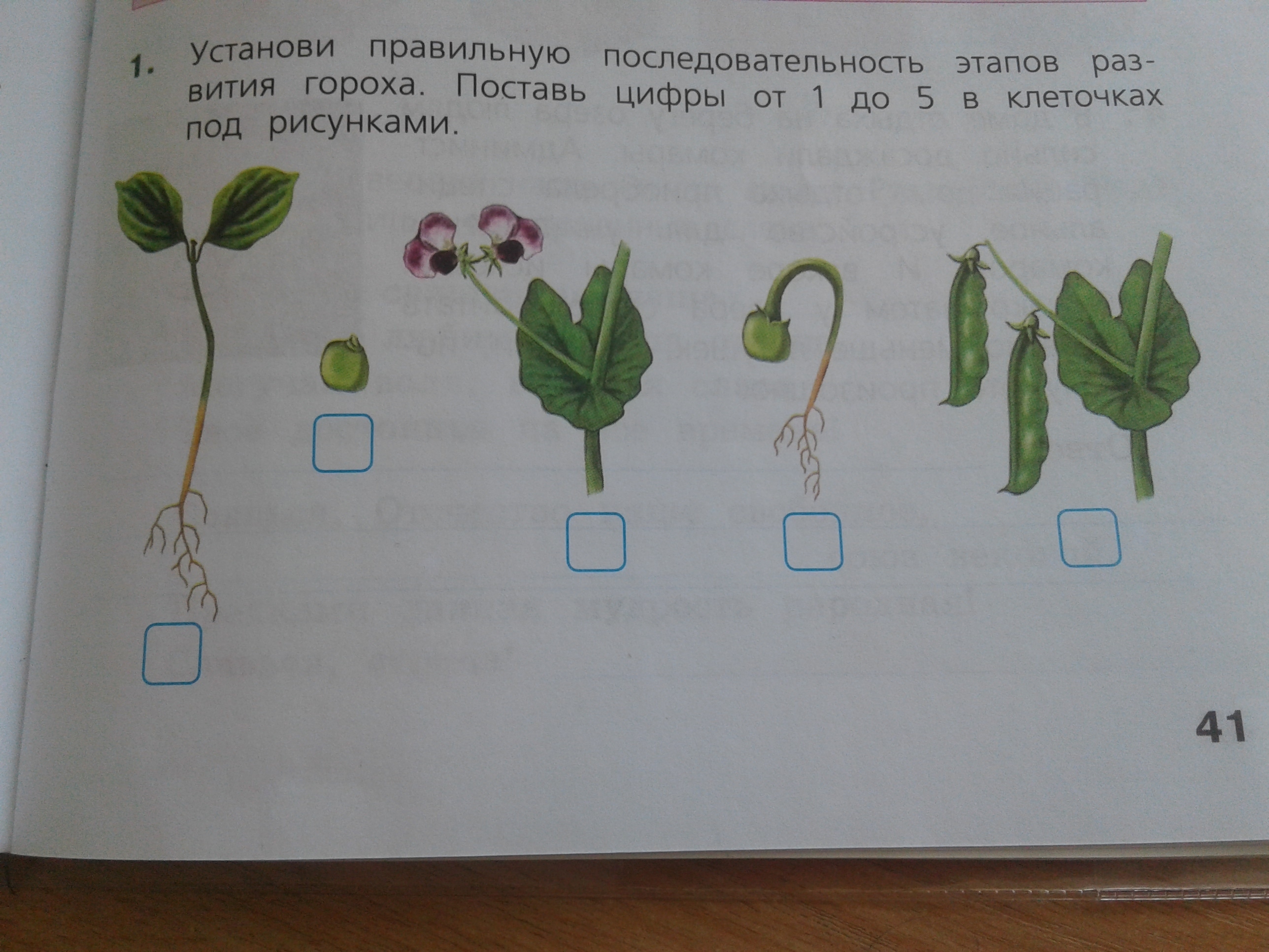 Установи правельную последавательность этапов развития гороха. Поставь цыфры от 1 до 5.