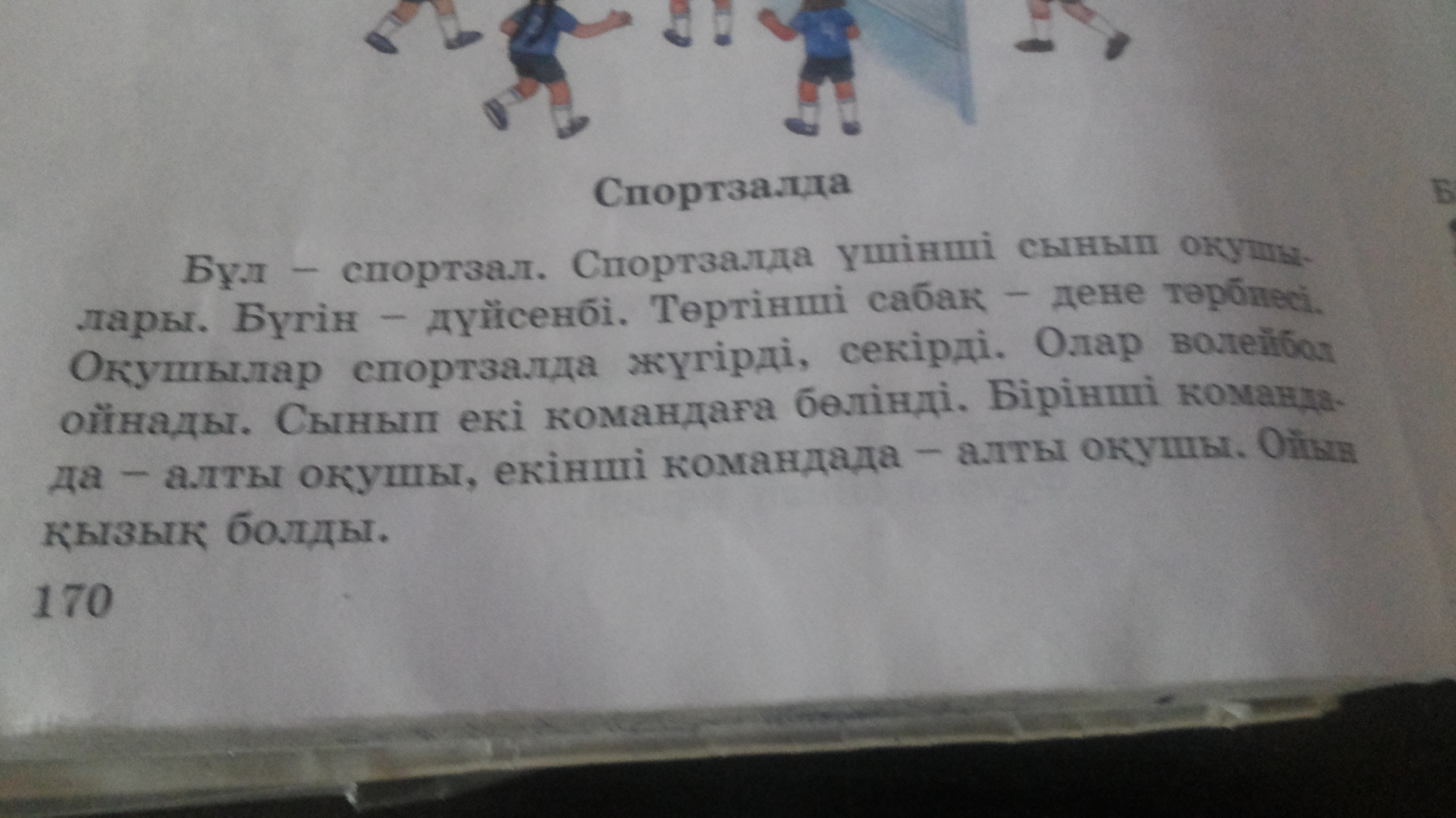 Это-Спортзал.В спортзале ученики третьего класса.Сегодня-понедельник.Четвертый урок-физкультура.Ученики в спортзале бегали,прыгали.Они играли в волейбол.Класс разделился на две команды.В первой команде-шесть учеников,во второй команде-шесть учеников.Игра была веселая.
