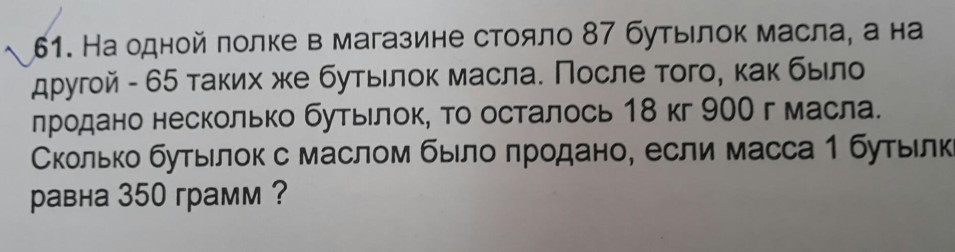 На одной полке в магазине стояло 87 бутылок масла, а на другой-65 таких же бутылок, то осталось18 кг 900 гр масла. Сколько бутылок с маслом было продано, если масса 1 бутылки равна 350 грамм?