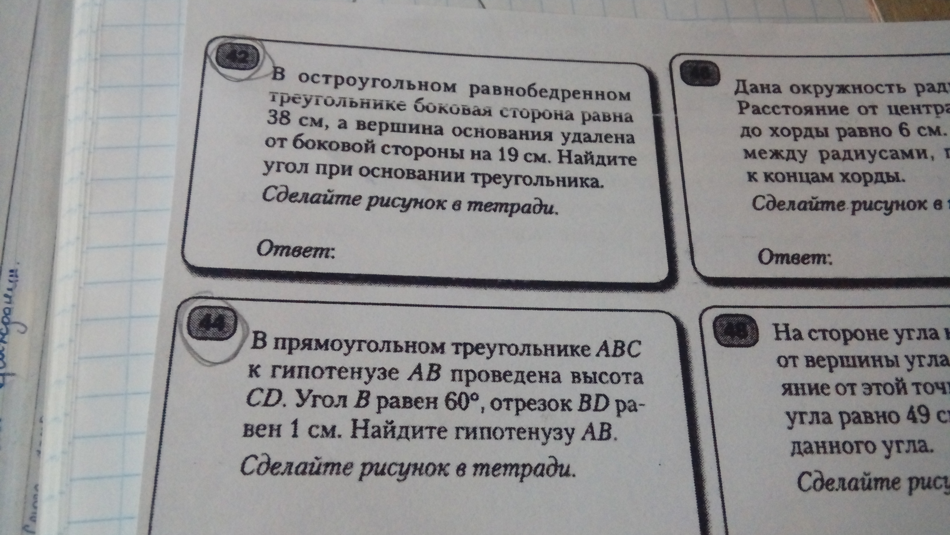 42. Перпендикуляр, проведенный от вершины основания к стороне, равен 19 см, а сторона - 38 см, значит, синус угла при вершине равнобедренного треугольника равен 19/38 = 1/2, он равен 30°. Тогда угол при основании составляет (180 - 30)/2 = 75°.