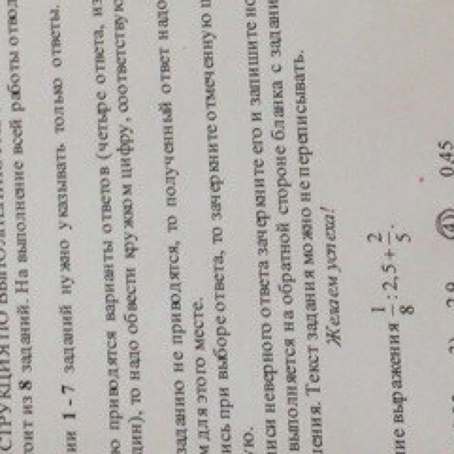 1/8 : 2,5 + 2/5 = 1/8 : 25/10 + 2/5 = 1/8 * 10/25 + 2/5 = 1/20 + 2/5 = 1/20 + 8/20 = 9/20 = 0,45