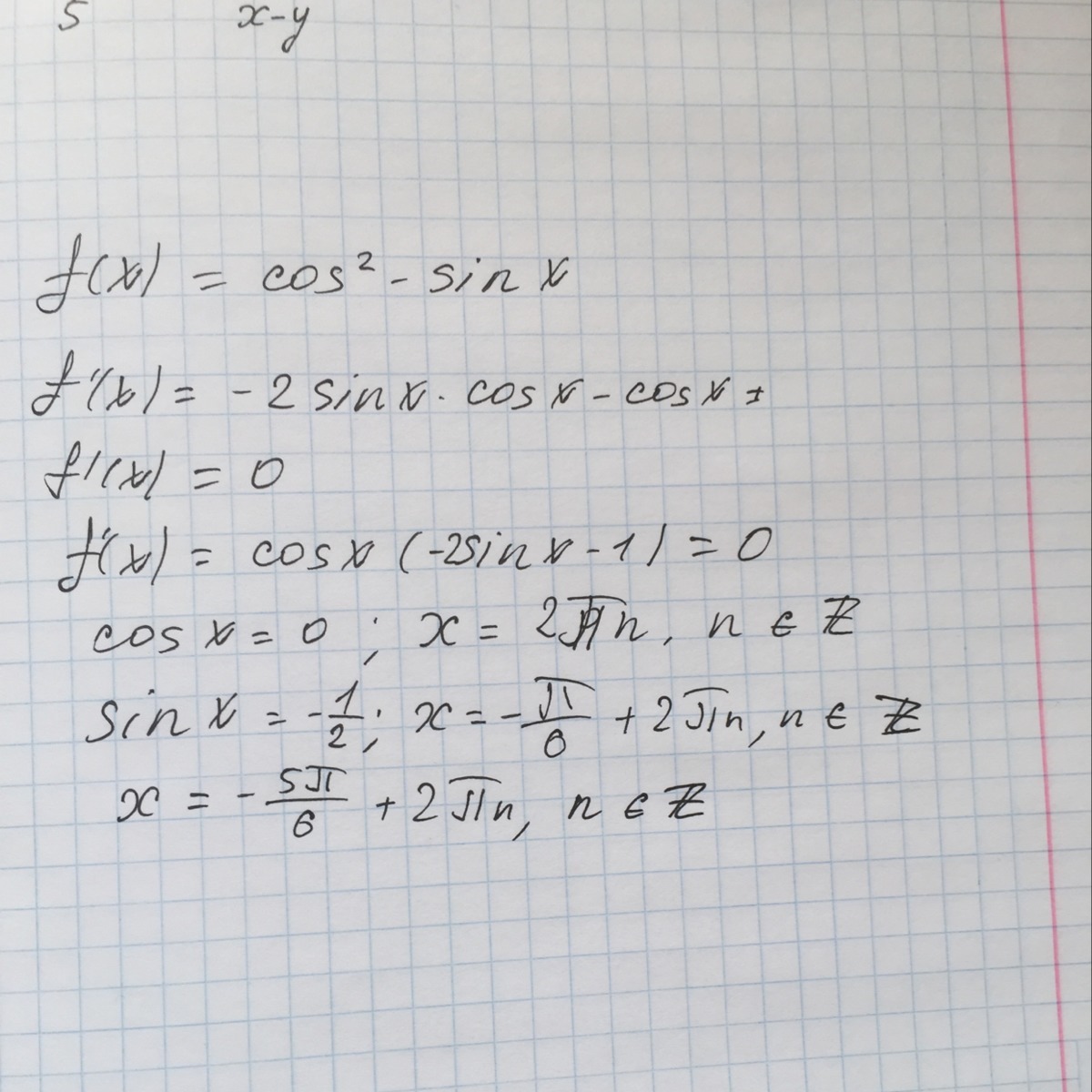 Функцию задано формулой f(x)=cos²x-sin x. Найти производную функции f(x). Решить уравнение f'(x) =0.