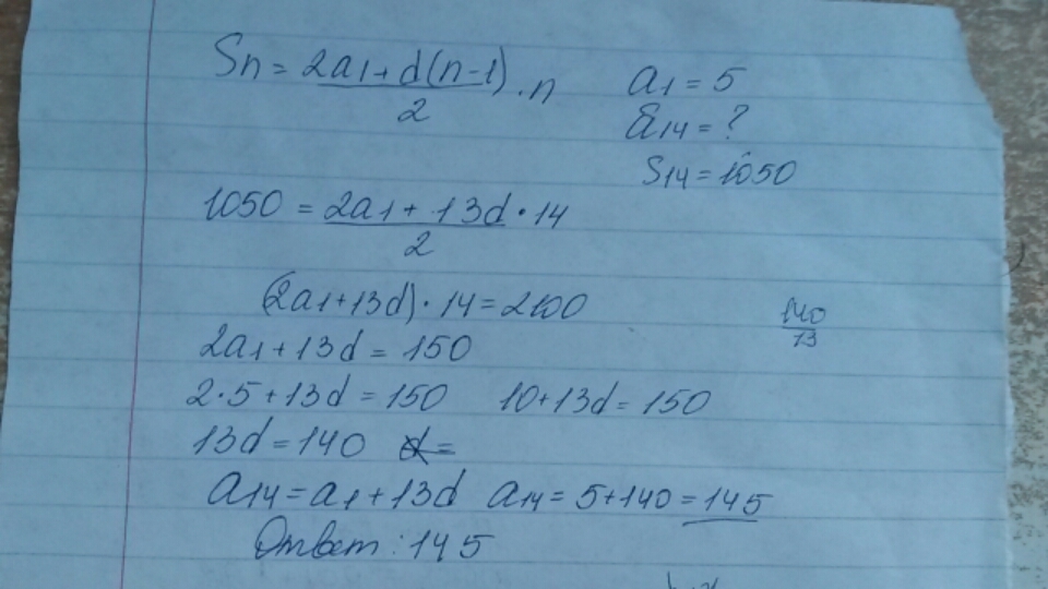 Помогите с заданием :Первый членов арифметической прогрессии равен 5,а сумма 14-ти первых членов 1050. Найдите 14-ый член этой прогрессии