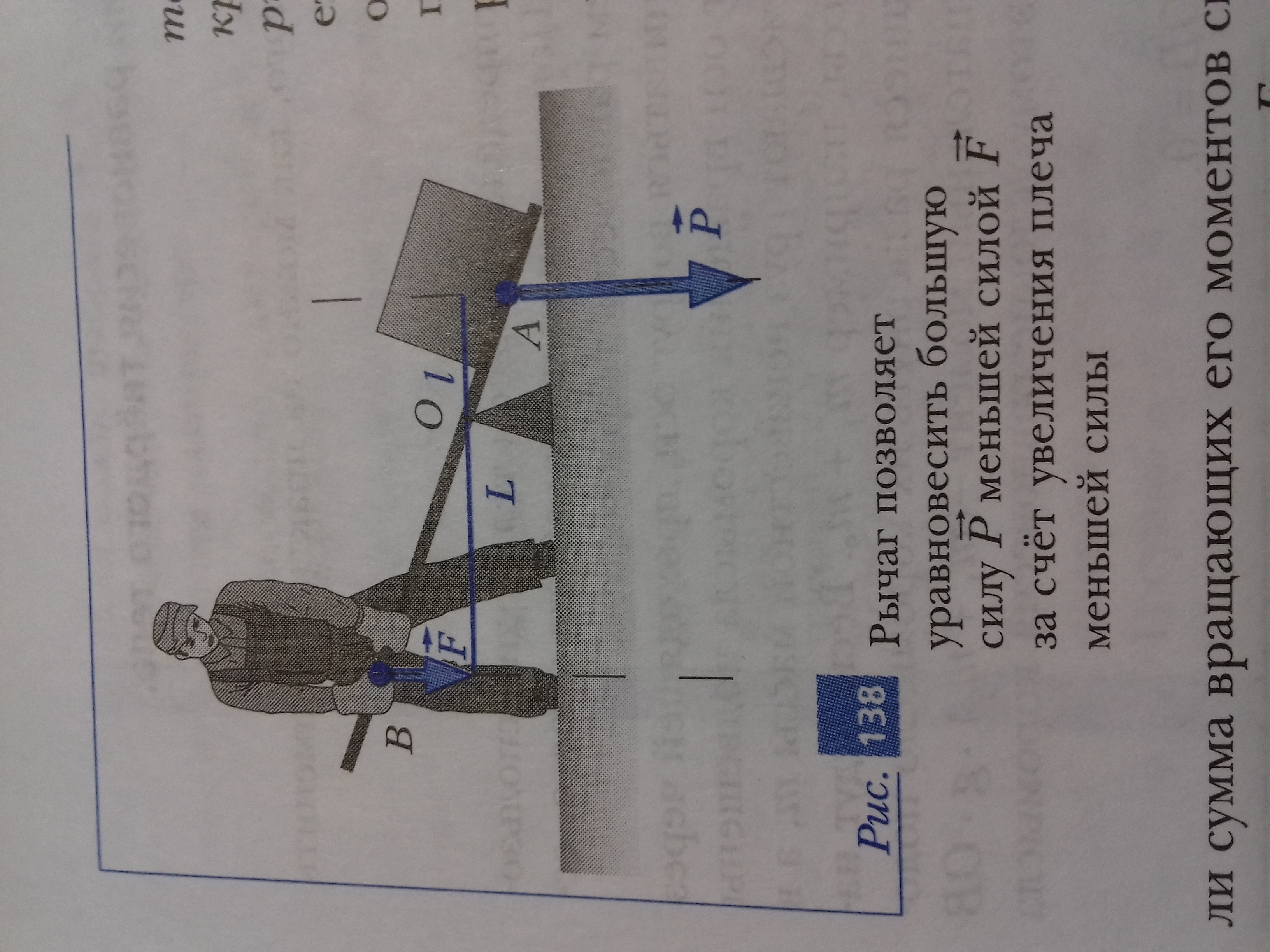 Определите массу камня, который поднимает человек (рис.138), прикладывая силу F, модуль которой равен 800 Н. Расстояние ОВ=3 м, ОА=40 см. Массой рычага можно пренебречь.