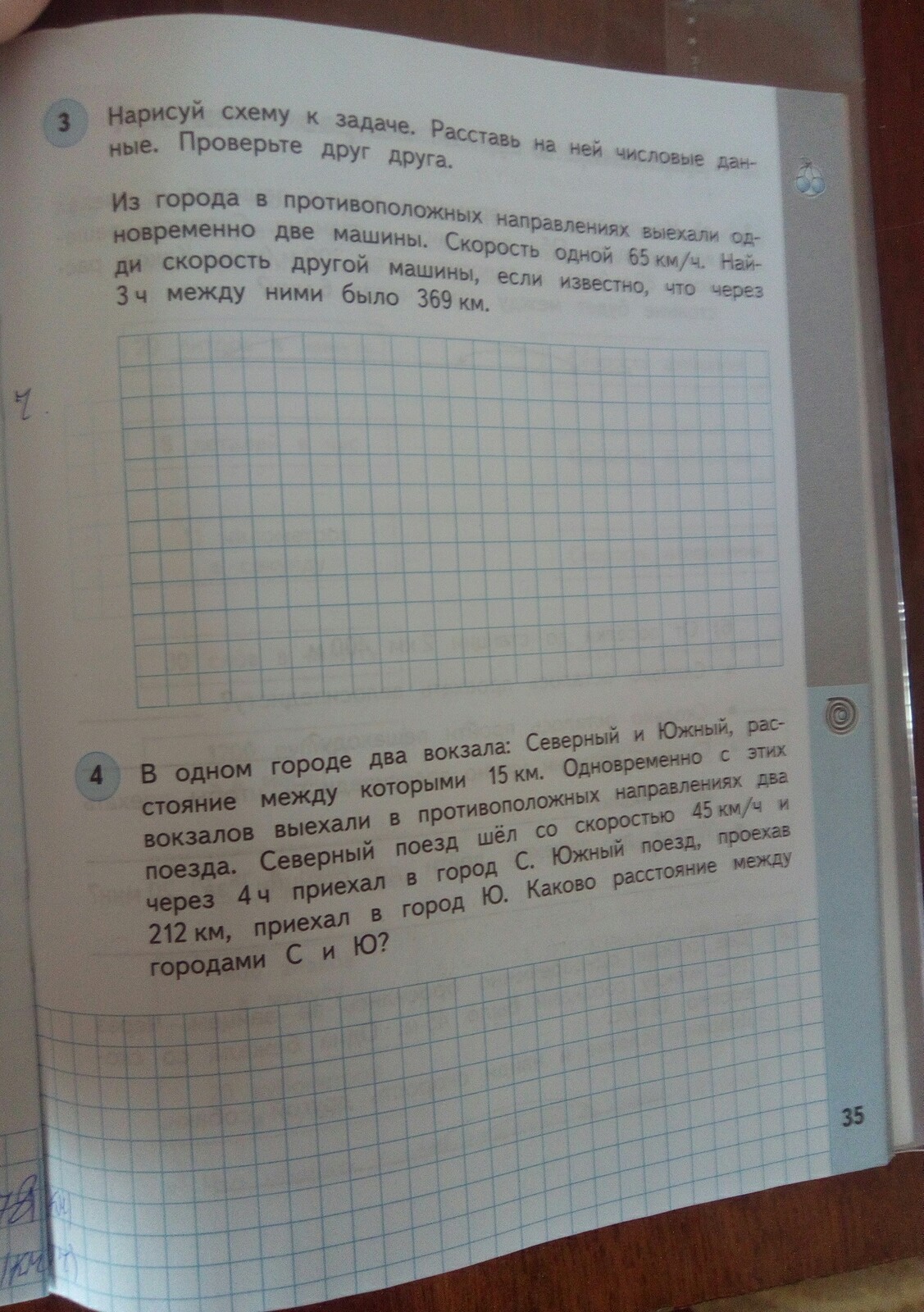 Схема -- из 1 точки по цетру рисуем 2 стрелки в разные стороны. Одну стрелку подписываем 65 км/ч, другая --? км/ч. Т.к. время в движении 3 ч, то делим обе части на 3 отрезка. Вся прямая - 369 км.