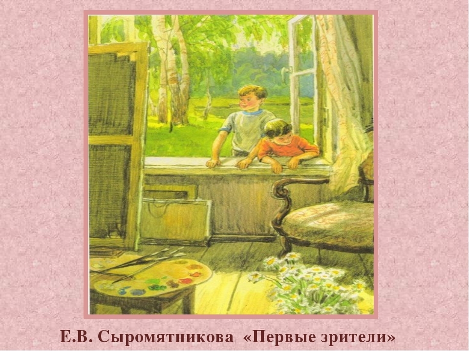 Два деревенских мальчика прогуливались по роще и решили заглянуть в распахнутое окно домика. Старший мальчик одет в белую футболку с синим воротничком, на его лице изображены удивление и восторг от увиденной им картины этого художника. Младший мальчик в красной рубашке рассматривает старинное резное кресло, которое расположено в комнате. В левом углу комнаты стоит табурет. На нем лежит палитра с красками и кистями. Справа от табурета, на деревянном полу – ваза с ромашками. Под окном лежат холсты и рамки для картин. На окне висит белая занавеска.