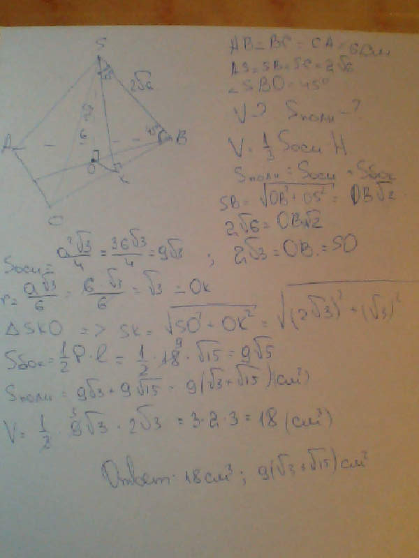 В правильной триугольной пирамиде боковое ребро равняеться ( два корня из шести см) и составляет с плоскостью угол 45 градусов , сторона основы 6 см. Найти обьем пирамиды , площадь полной поверхности пирамиды!