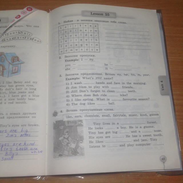 4) Tiny leves in a small forest. He looks like a boy. He is gnome. Tiny has got big ears and a small nose. His eyes are kind. He has a sweet tooth. He likes chocolate and jam. Tiny listens to music and play computer games.