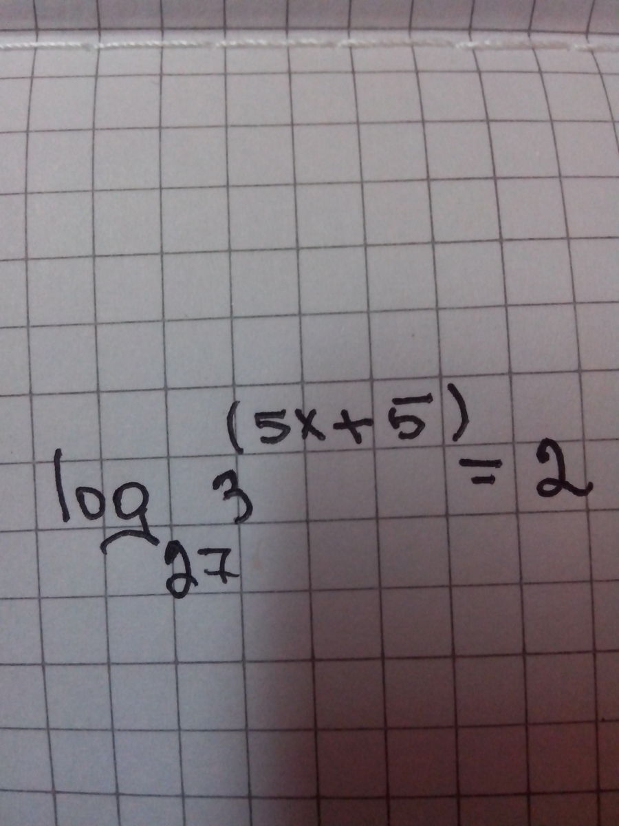 log_{27}3^{5x+5}=2\ 3^{5x+5}=27^2\ 3^{5x+5}=(3^3)^2\ 3^{5x+5}=3^6\ 5x+5=6\ 5x=1\ x=frac{1}{5}