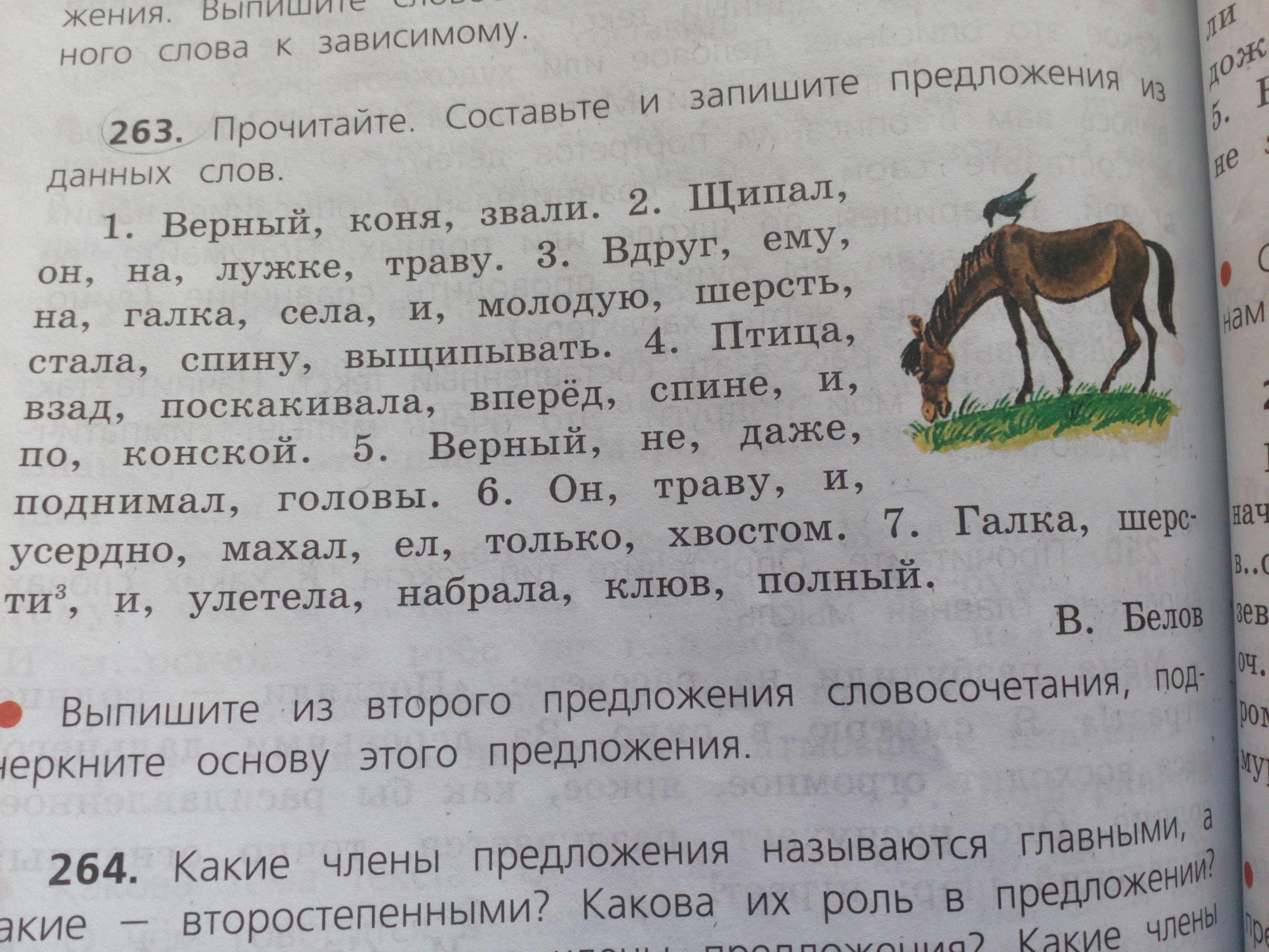1.Коня звали Верный 2.Он щипал траву на лужке 3.Вдруг галка села ему на спину и стала выщипывать шерсть 4.Птица по конской подскакивала вперед назад и в перед 5.Верный не поднимал даже головы 6.Он ел траву,и усердно махал хвостом 7.Галка набрала полный клюв шерсти и улетела.