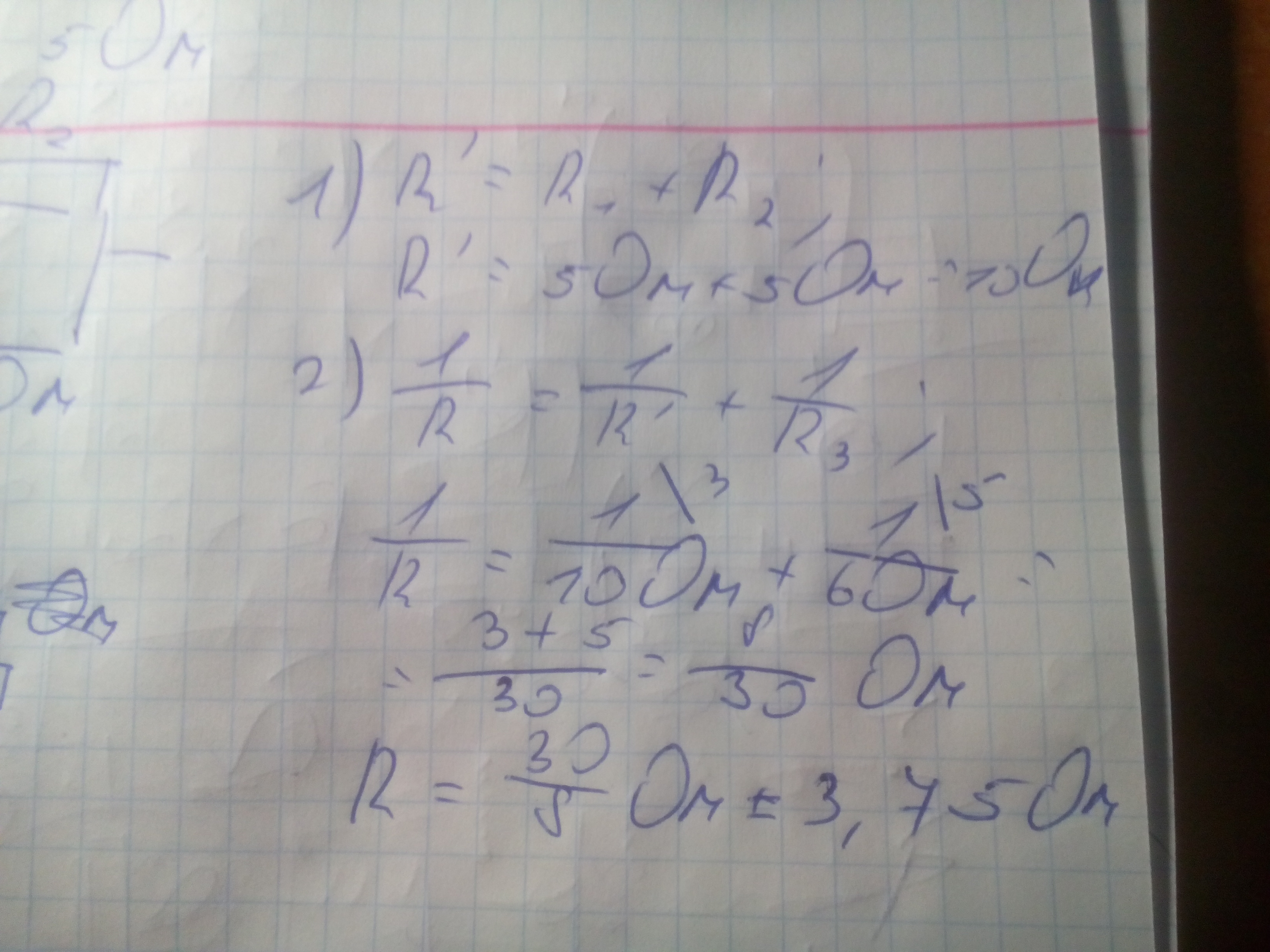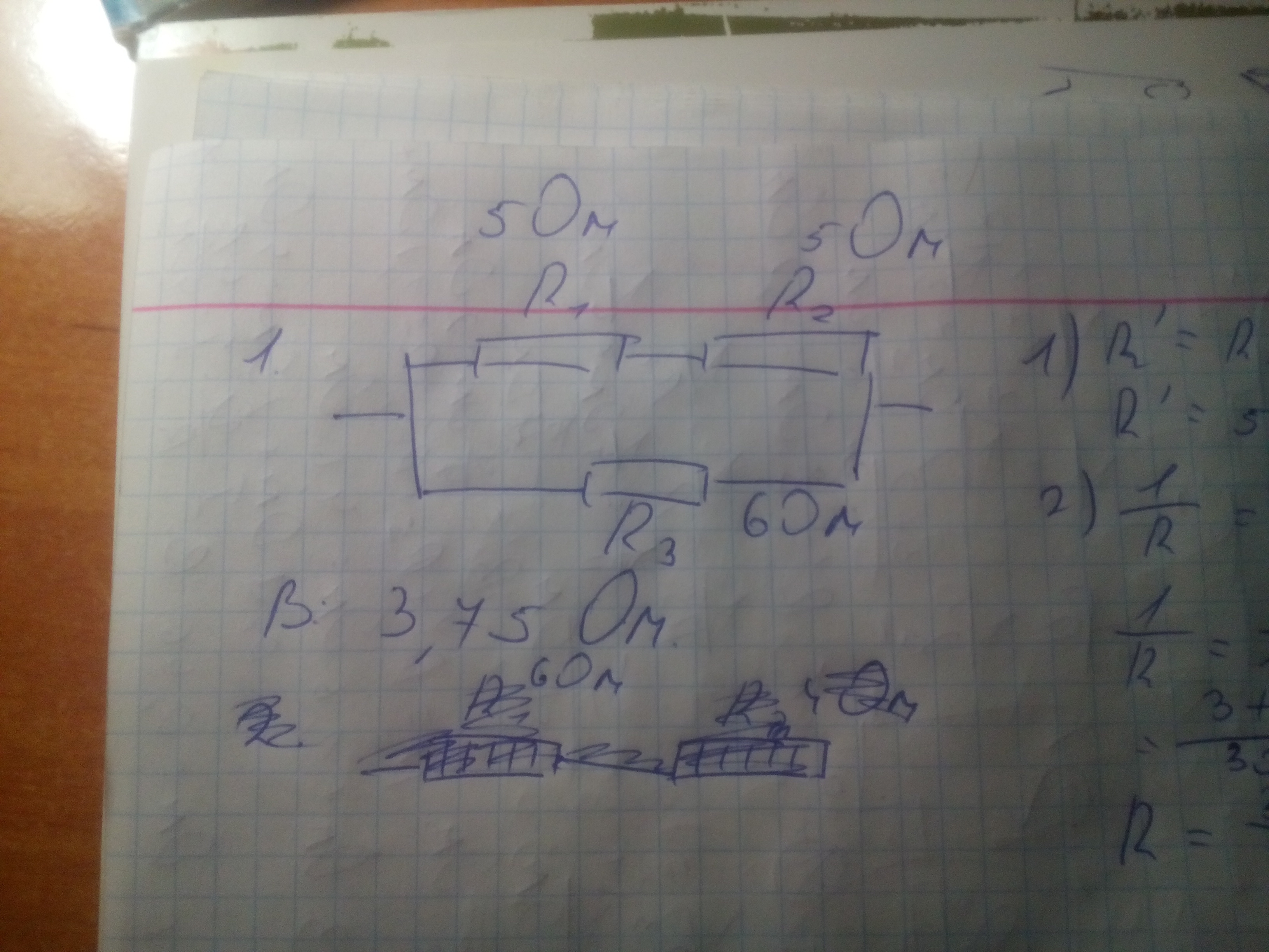 1. Складываем сопротивления, подключенные последовательно R1=5+5=10 Ом. Параллельно к этим двум резисторам соединен резистор сопротивлением R2=6 Ом; Rобщ=R1*R2/(R1+R2); Rобщ=6*10/(6+10=)3.75 Ом