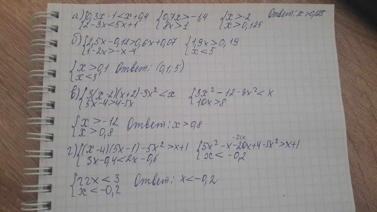 помогите с решением, номер 954, решите систему неравенств: а) 0,3х-1 меньше х+0,4 , 2-3х меньше 5х+1 ; б) 2,5х-0,12 больше 0,6х+0,07 , 1-2х больше -х-4 ; в) 3(х-2)(х+2)-3х в квадрате меньше х , 5х-4 больше 4-5х ; г) (х-4)(5х-1)-5х в квадрате больше х+1 , 3х-0,4 меньше 2х-0,6 СПАСИБО