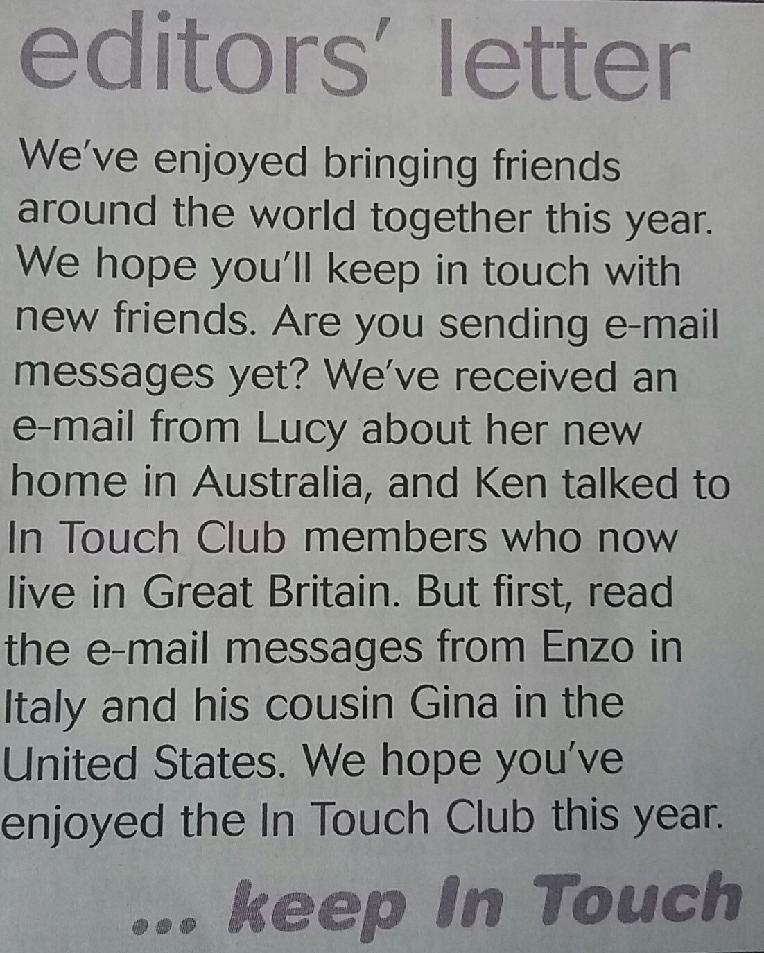 Мы уже получили электронное письмо от Люси о её новом доме в Австралии, и Кен общался с членами клуба In Touch, которые живут сейчас в Великобритании. Но, прежде всего, прочтите сообщения от Энзо из Италии и его кузины Джины из США. Мы надеемся, что вы получили удовольствие, находясь в нашем клубе In Touch в этом году.