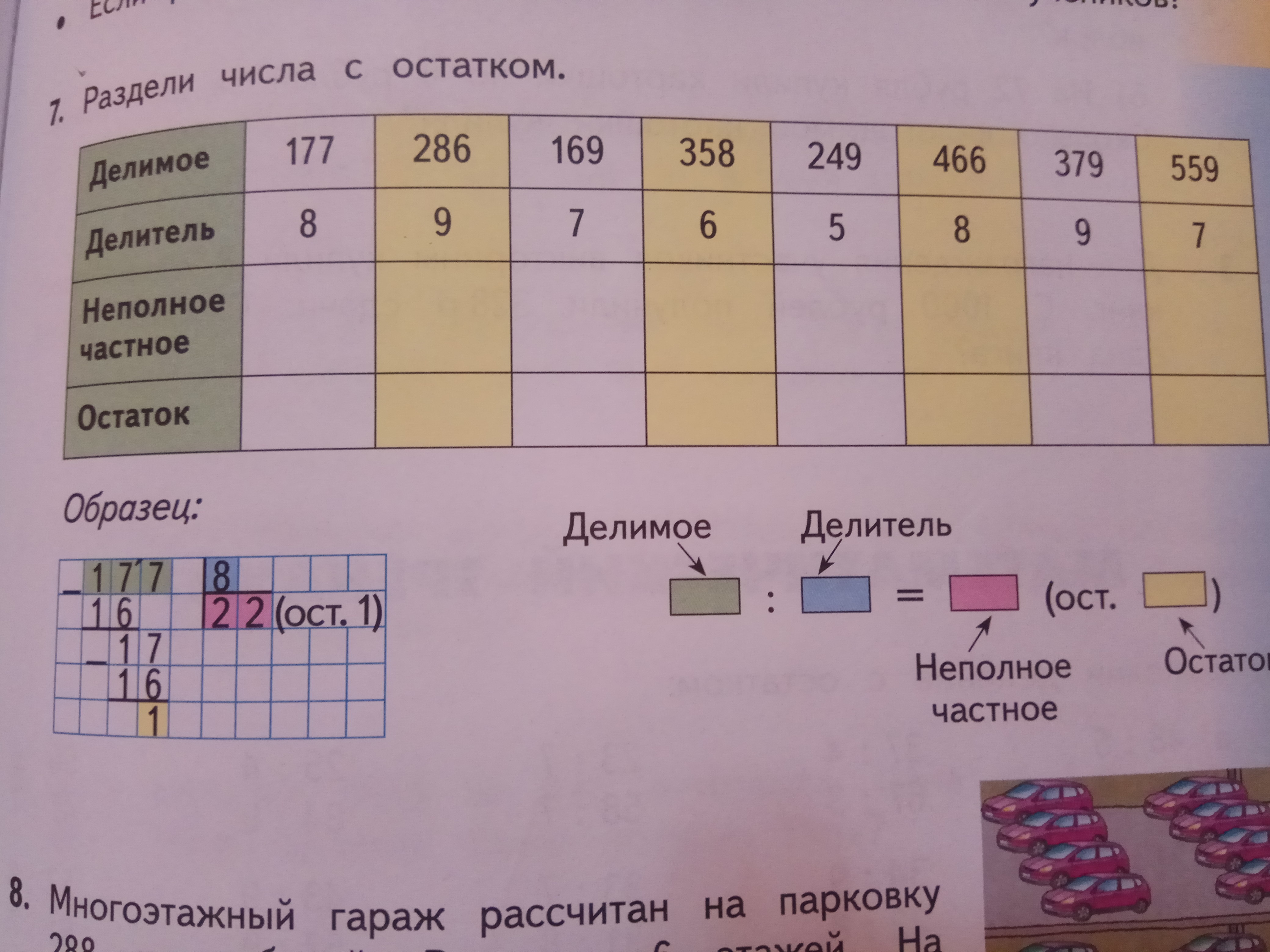 делимое 177, делитель 8, неполное частное 22, остаток 1