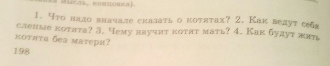 Котята-это животные и о них надо заботиться.Слепые котята ничего не видят.Мама учит котят постоять за себя.Например:как слезть с дерева.Котятам будет без мамы плохо,как и людям.Последнее предложение это конец.Основная мысль первое предложение.