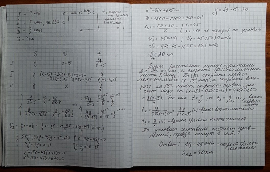 Три мотоциклиста выехали одновременно из пункта А. Скорость второго на 25% меньше скорости первого. Скорость первого на 15 км/ч меньше скорости третьего. Определите скорость третьего мотоциклиста и расстояние между пунктами А и В, если первый мотоциклист приехал в пункт В позже третьего на 12 мин и раньше второго на 20 мин