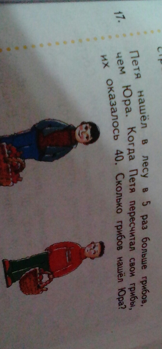 Петя нашел грибов - 40 грибов, это в 5 раз больше грибов, чем нашел Юра.