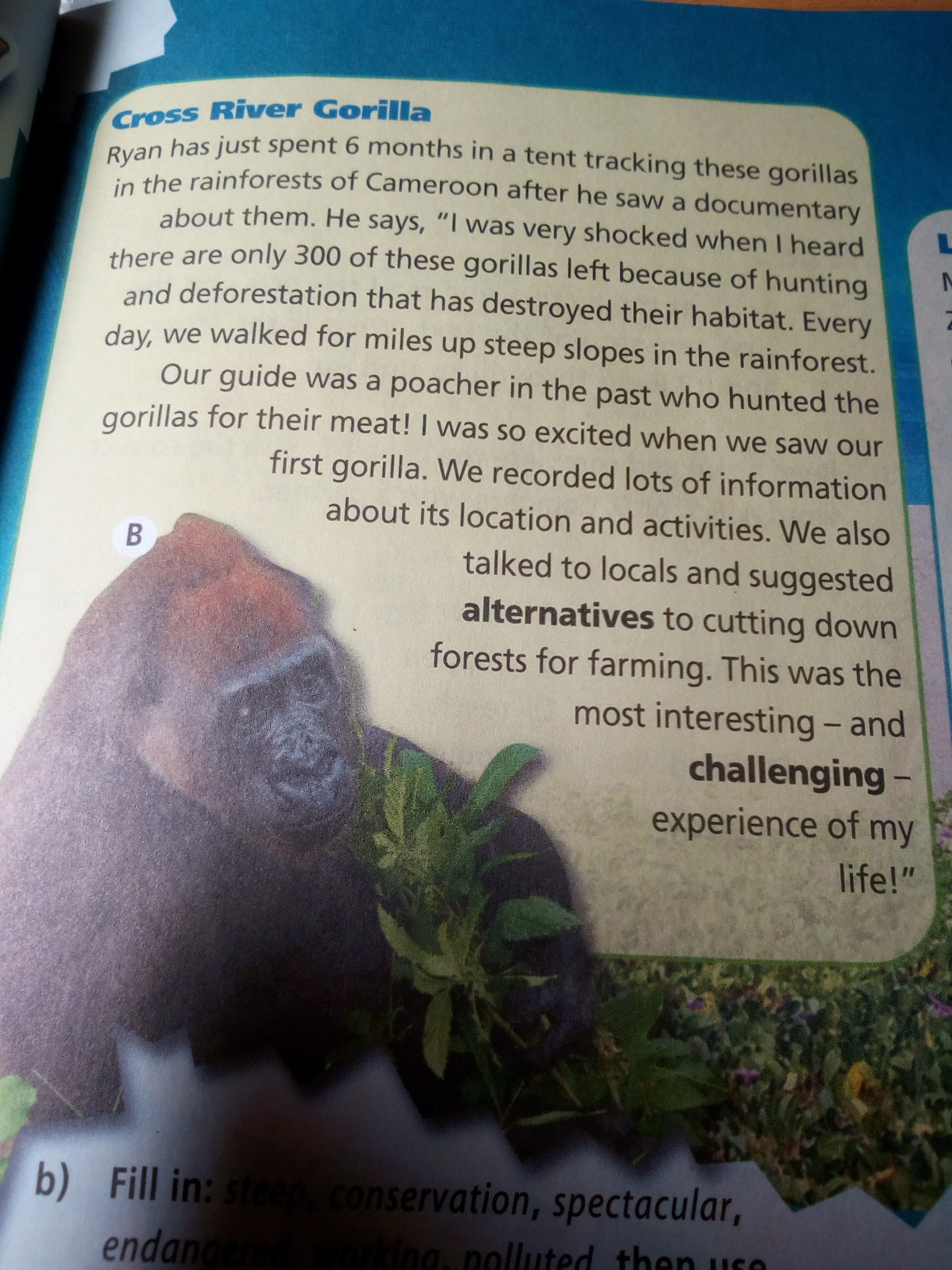 Крест-Ривер Горилла имеет только 6 месяцев в палатке эти о лесах Камеруна после того, как он увидел документальный фильм их. Он «Я был очень шокирован, когда услышал Райана, что осталось всего 300 из этих горилл из-за охоты и обезлесения, которые разрушили их среду обитания. Каждый день мы гуляли по крутым склонам в тропическом лесу, наш проводник был браконьером в Прошлое, кто охотился на горилл за своим мясом! Я был так взволнован, увидев нашу первую гориллу. Мы записали много информации о ее местонахождении и деятельности. Мы также поговорили с местными жителями и предложили альтернативы сокращению лесов для сельского хозяйства. Интересный и захватывающий опыт в моей жизни! "