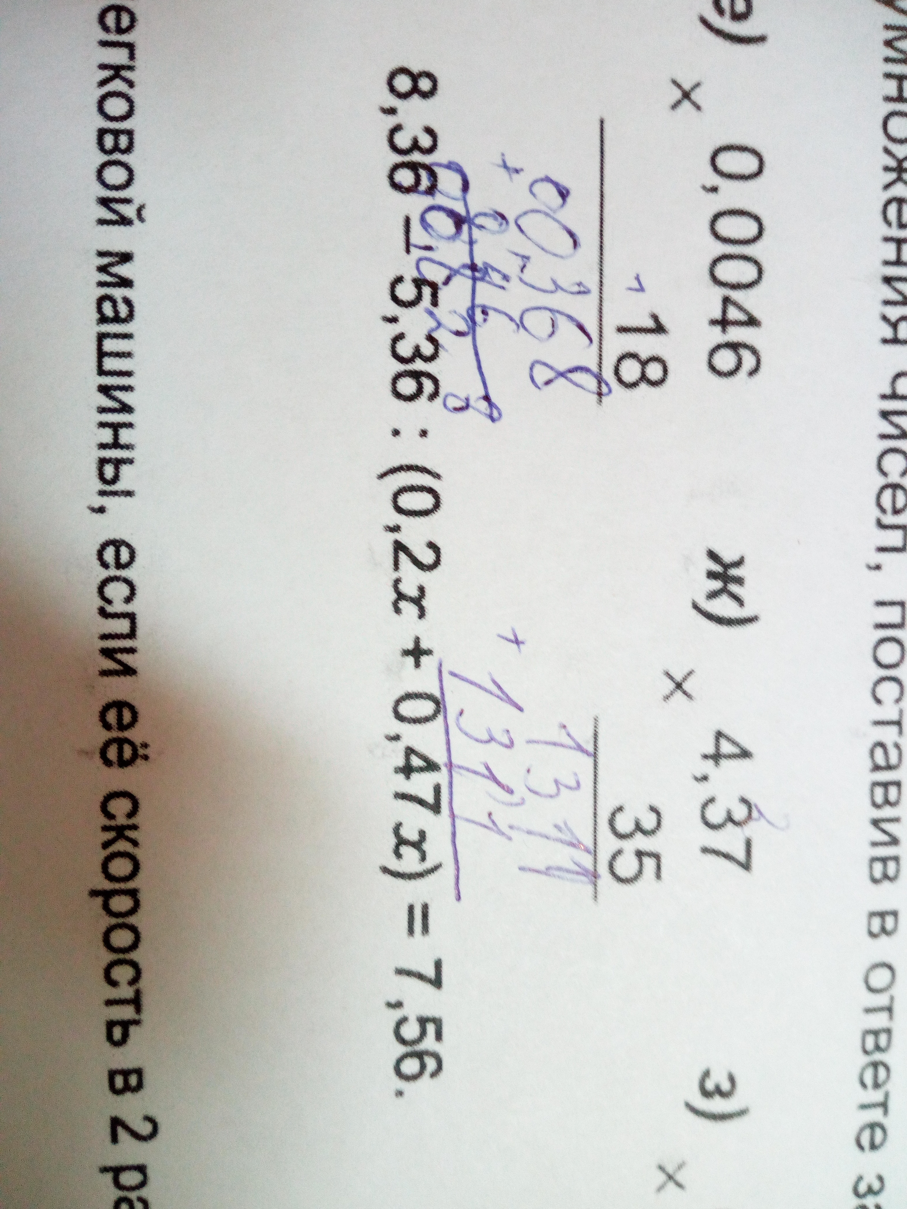 8,36 - 5,36 : ( 0,2x * 0,47x ) = 7,56