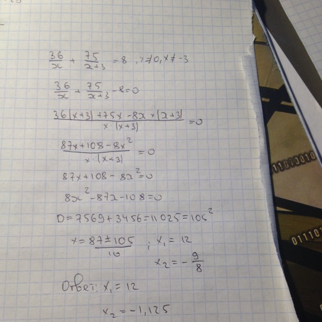 36/х + 75/(х+3)=8