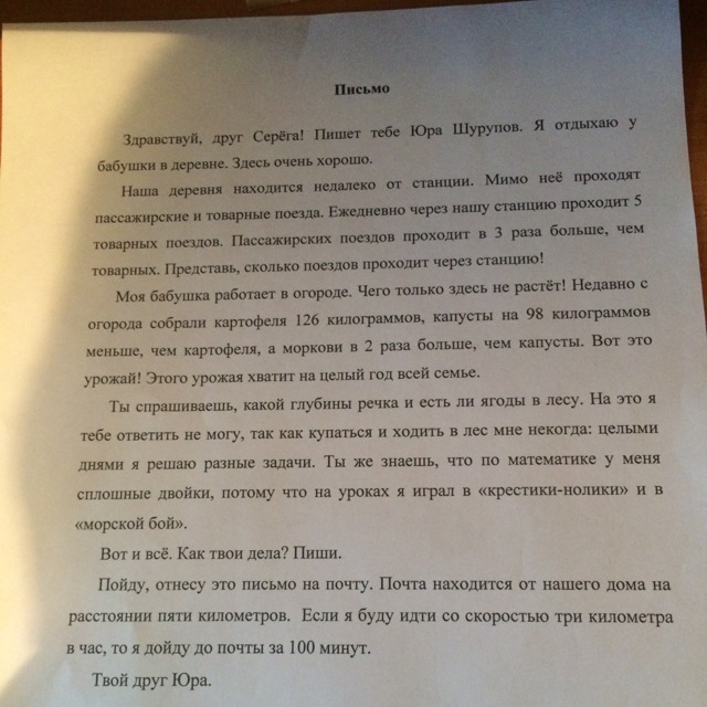 станции,проходит,товарных,поездов,Пассажирских,поездов,проходит,больше,товарных,представь,сколько,поездов,проходит,станцию,бабушка,только,здесь, собрали,картофеля,килограммов,капусты,килограммов,картофеля,больше,капусты,всей,семье,спрашиваешь,какой,купаться,днями,задачи,знаешь,сплошные,крестики,бой,твои,дела,пиши,пойду,письмо,почту.Почта,дома,пяти,километров,буду,скоростью,три,километра,дойду,почты,друг