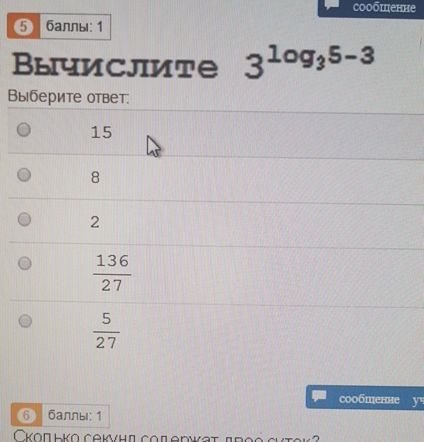 $$Large3^{log_3{5}-3}=3^{log_3{5}-3log_33}=3^{log_3{5over3^3}}={5over27}$$