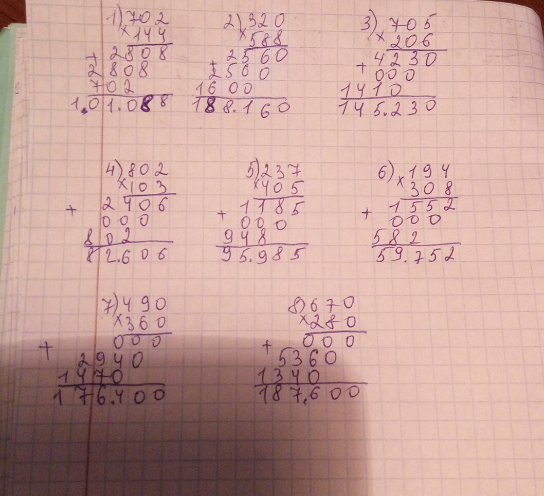 Решите все примеры в столбик 702*144= 320*588= 705*206= 802*103= 237*405= 194*308= 490*360= 670*280=