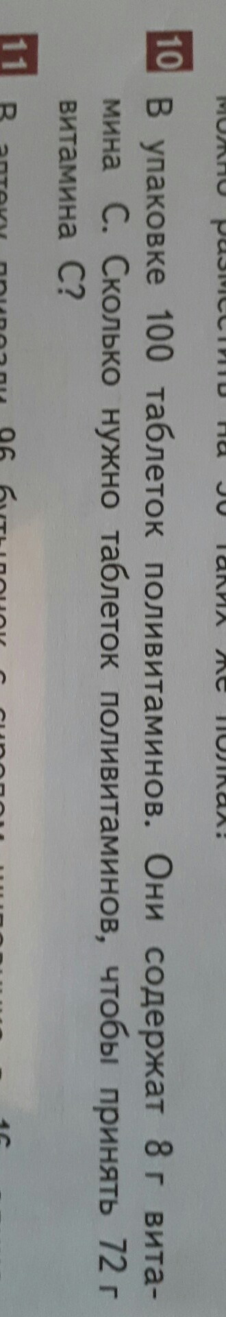 В упаковке 100 таблеток поливитаминов. Они содержат 8 г витамина С. Сколько нужно таблеток поливитаминов, чтобы принять 72 г витамина С?