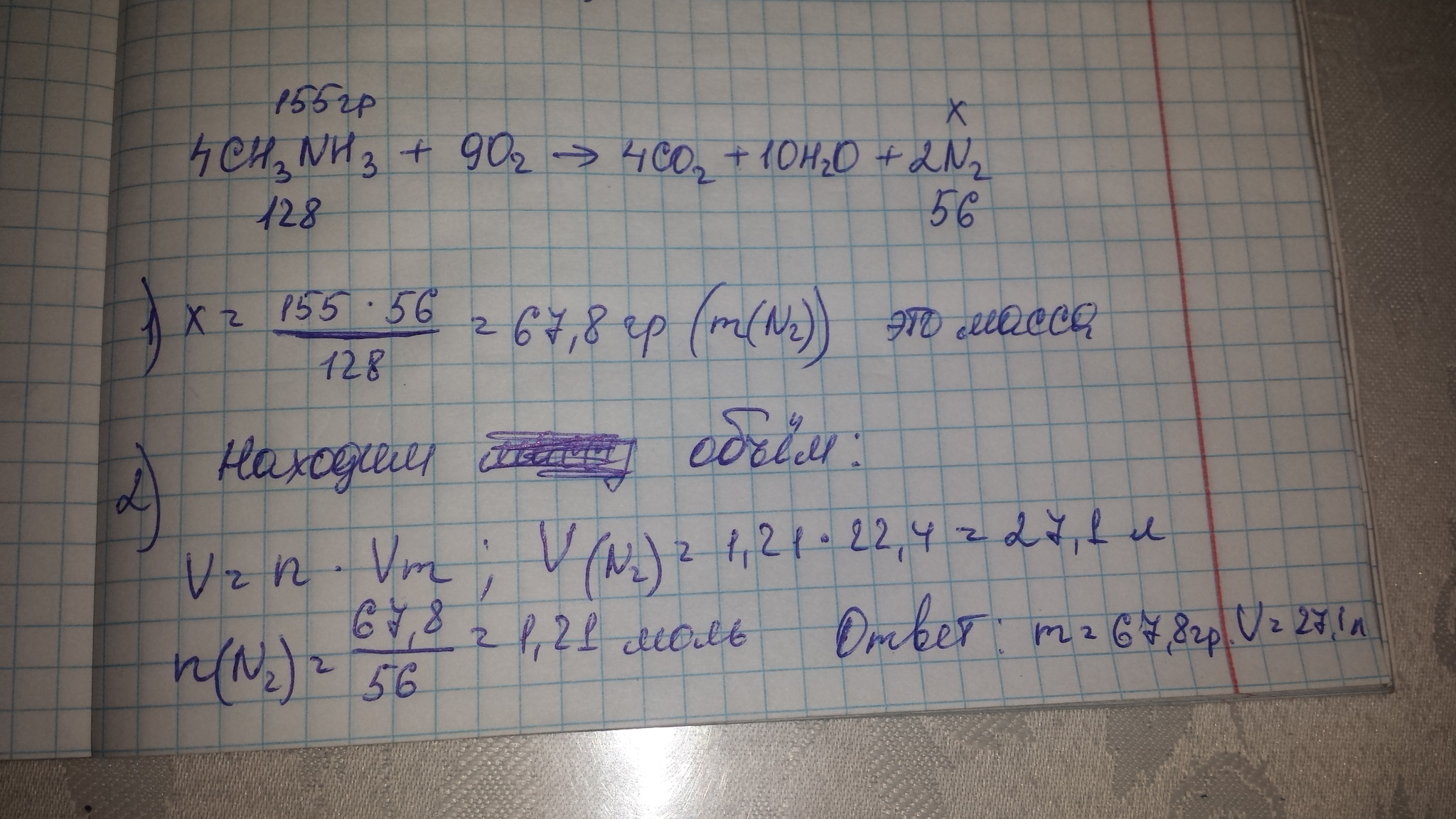 Определите массу и объём азота , полученного при сгорании (н.у.) 155 г метиламина.