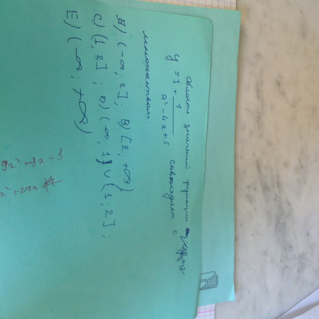 Ответ С). Так как знаменатель дроби принимает значения [3;+∞),так как вершина параболы у=х²-4х+5 точка ( 2;3). А значит заданная функция будет принимать значения(1;2).