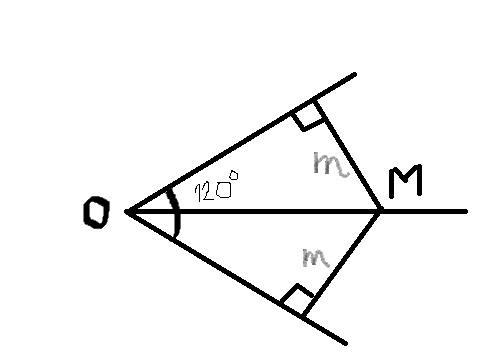 Если провести биссектрису через точку М и вершину этого двугранного, то получим два одинаковых прямоугольных треугольника. Угол в 120 градусов разделится пополам. Будет по 60 градусов. Расстоянием будет ОМ - гипотенуза этих треугольников. Катеты, противолежащие углу 60 градусов известны и равны m. Чтобы найти гипотенузу, надо катет, противолежащий углу в 60 градусов разделить на синус 60 градусов.