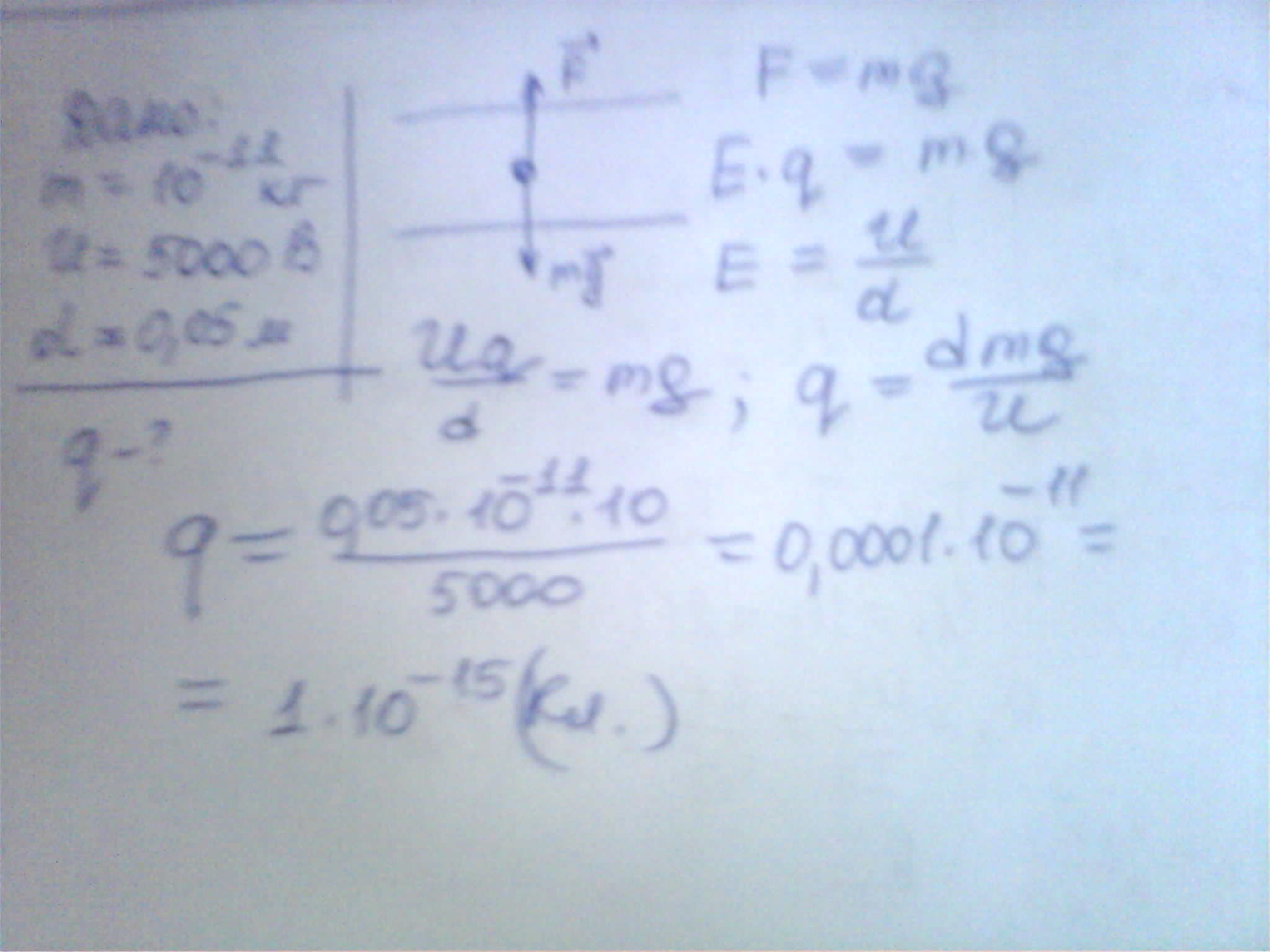 Пылинка, масса которой кг, находится между горизонтальными пластинками. К пластинам приложено напряжение 5 кВ. Расстояние между ними 0,05 м. Какой заряд имеет пылинка, если она висит неподвижно (в воздухе). Плис пишите полное решение!