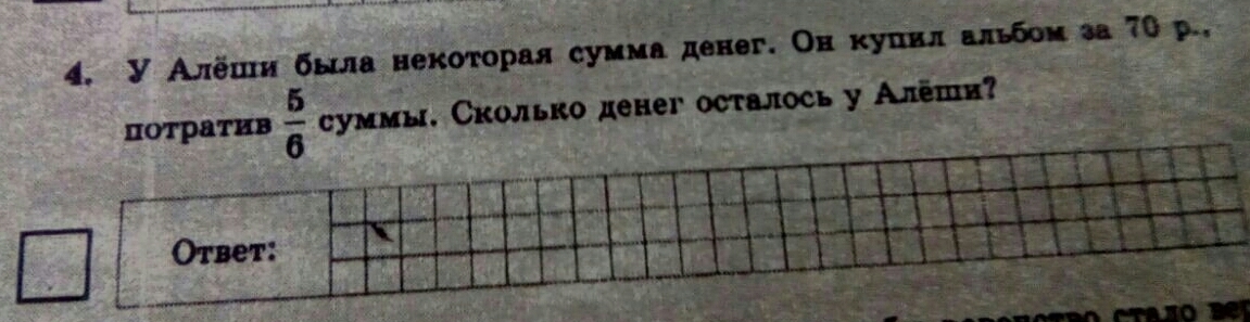 У Алёши была некоторая сумма денег. Он купил альбом за 70 р,.потратив 5_6 суммы. Сколько денег осталось у Алёши?