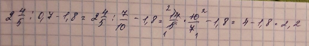 2 4/5÷0,7-1,8=2,8÷0,7-1,8=4-1,8=2,2.