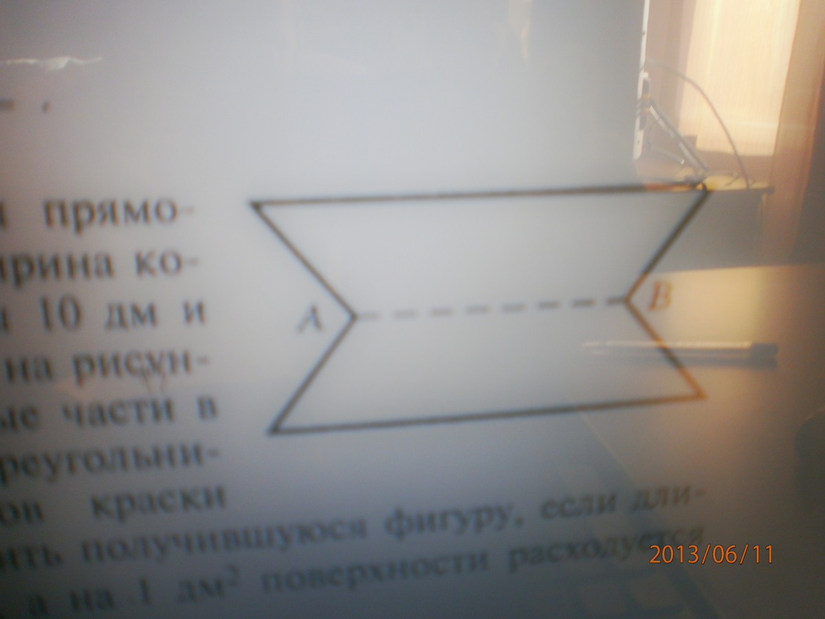Имеется лист фанеры прямоугольной формы, длина и ширина которого соответственно равны 10 дм и 5 дм. Из него, как показано на рисунке, вырезаны две одинаковые части в форме равнобедренных треугольников. Сколько киллограммов краски потребуется, чтобы покрасить получившуюся фигуру, если длина отрезка AB равна 6 дм, а на 1 дм2 поверхности расходуется 0,012 кг краски? ответ 0,48