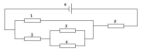 До джерела живлення з ε приєднали п’ять резисторів так, як показано на схемі. Опори резисторів відомі. Знайти: розподіл напруг та сил струму у колі. E = 50 B, R1=5, R2=2, R3=6, R4=6, R5=8 ;