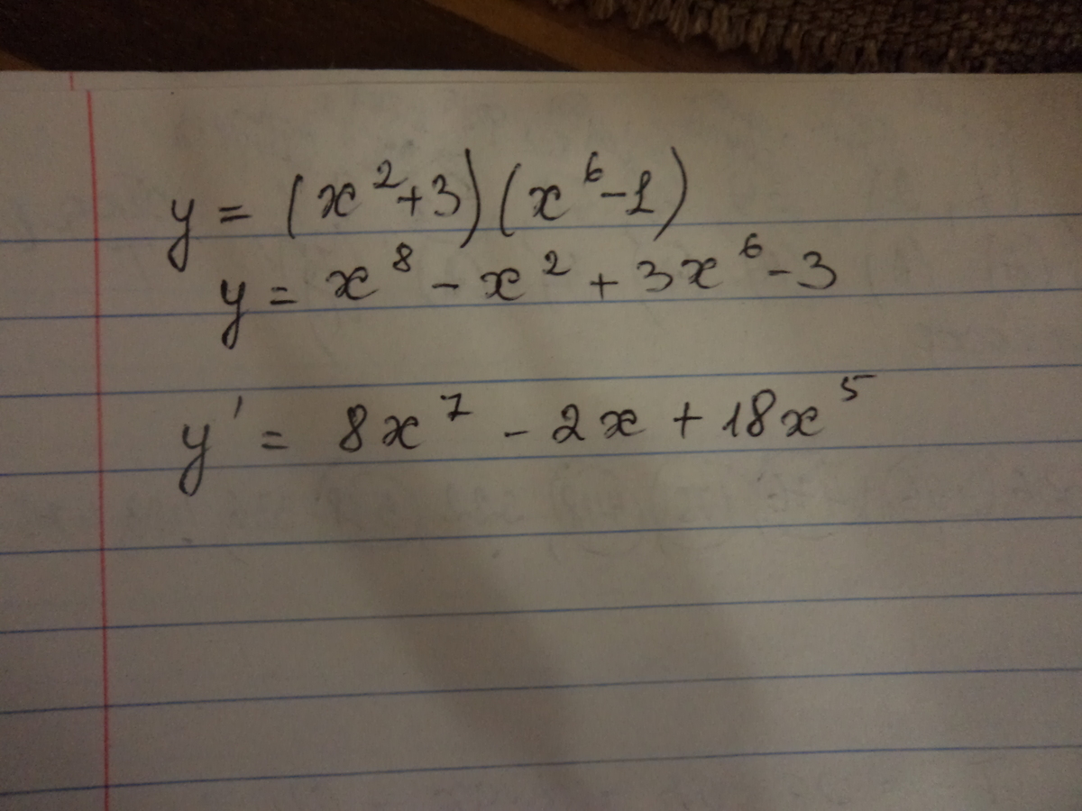 y'=((x^2+3)(x^6-1))'=(x^2+3)'(x^6-1))+(x^2+3)(x^6-1)'=2x*(x^6-1)+6*x^5(x^2+3)=8x^7+18x^5-2x