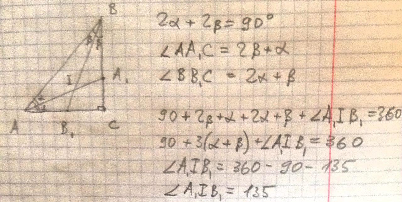 Обозначим углы A1AC и A1AB - α, B1BA и B1BC - β. Исходя из суммы углов треугольника, запишем несложные соотношения, получим значения углов AA1C и BB1C. Дальше, исходя из суммы углов четырёхугольника запишем выражение с участием угла A1IB1. По скольку 2α + 2β (сумма острых углов прямоугольного треугольника) = 90°, 3α + 3β = 135°. Ну и после несложных преобразований получим значение искомого угла.