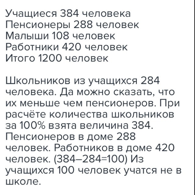 в доме живет 1200 человек из них 32процента это учащийся 24процента пенсионеры 9процентов это малыши а остальные работники известно из учащийся 74процента это школьники можно ли сказать учащийся больше чем пенсионеров какая величина взята за 100процентов сколько в доме не пенсионеров сколько в доме работников сколько из учащийся учится не в школе.
