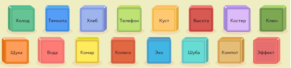 Высота,вода,куст,костер,ключ,комар,колесо,компот,темнота,телефон,холод,хлеб,шуба,щука,эхо,эффект