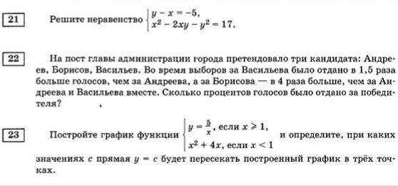 22. пусть х голосов за андреева,тогда 1.5х голосов за васильева и 4(х+1.5х)=10х голосов за борисова. составляешь уравнение 10х+1.5х+х=100 откуда х=8 и соответсвенно 10*8=80 процентов.
