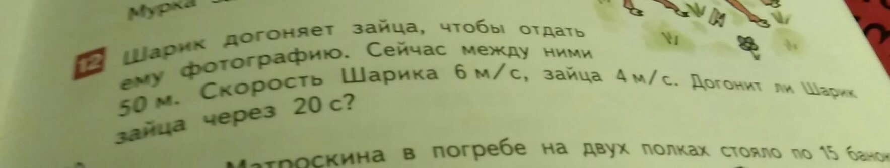 2) 50 м : 2м/с = 25 с - время, за которое Шарик догонит зайца.