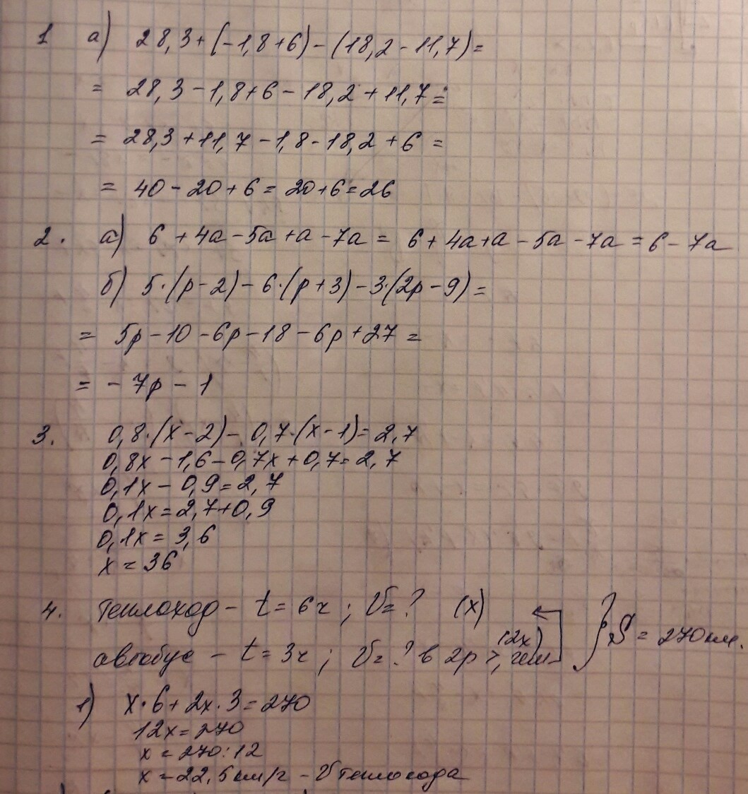 1.а ) 26 ; 2.а)6-7а ; б)-7р-1 ; 3. х=36 ; 4) Ответ: скорость теплохода равна 22,5 км/ч.