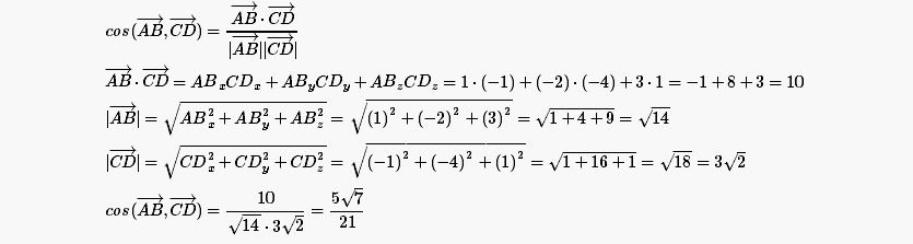 данные четыре точки А(0:1:-1), В(1:-1:2), С(3:1:0), Д(2:-3:1). Найти косинус угла между векторами АС и ВД