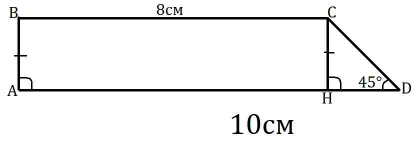 В прямоугольном ΔCHD (∠H=90°): ∠CDH=45° ⇒ ∠DCH=90°-45°=45° ⇒ ΔCHD - равнобедренный CH=HD=2см.