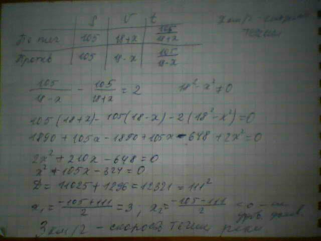Моторная лодка прошла по течению реки 105км и обратно столько же, затратив на путь по течению реки на 2 часа меньше времени, чем на путь против теченич. Собственная скорость лодки 18км/час. Найдите скорость течения лодки