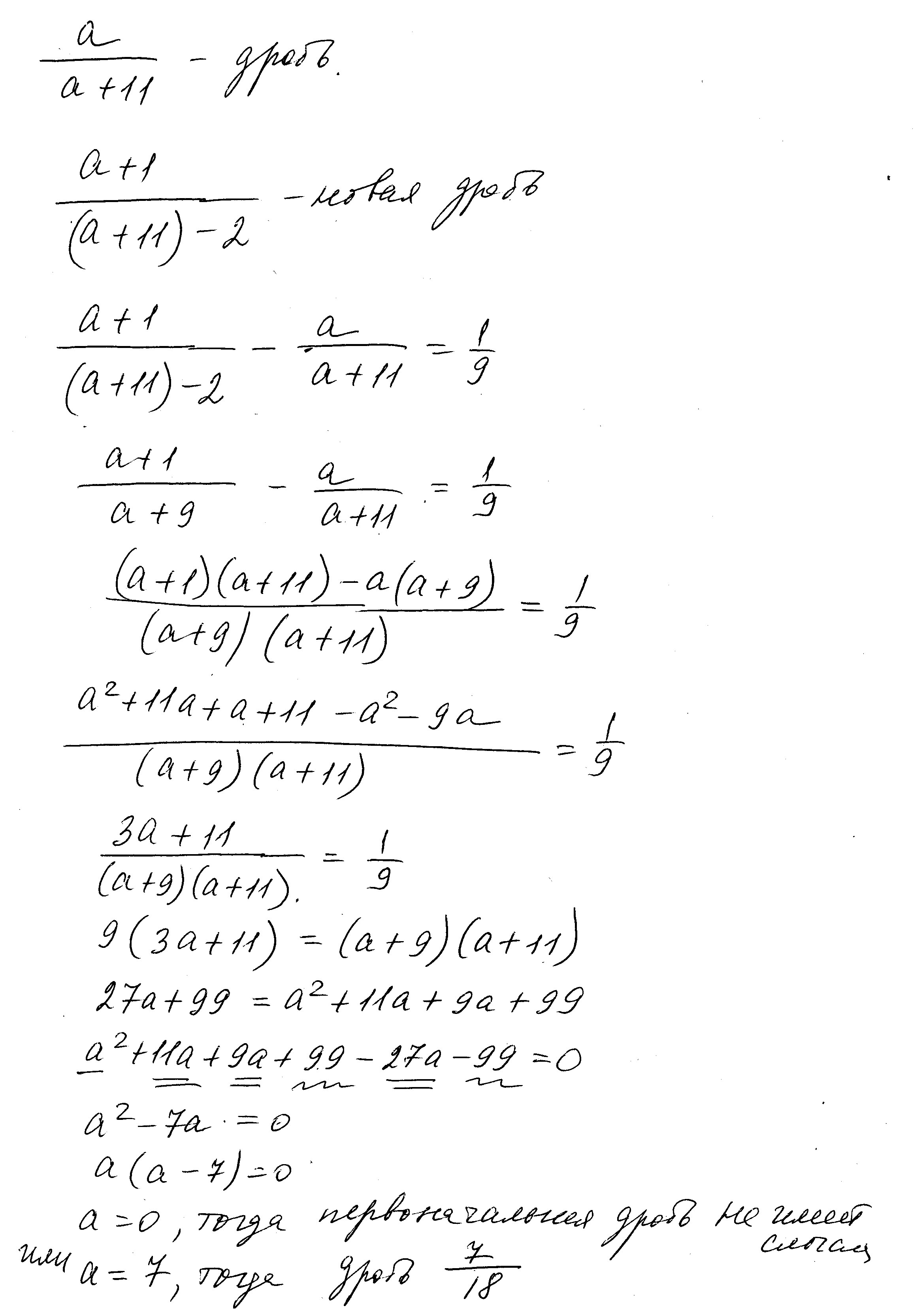 Знаменитель обычной дроби на 11 больший чем его числитель. Если числитель этой дроби увеличить на 1, а знаменитель уменьшить на 2, то полученая дробь будет на 1/9 больше чем начальная. Найдите начальный дробь.