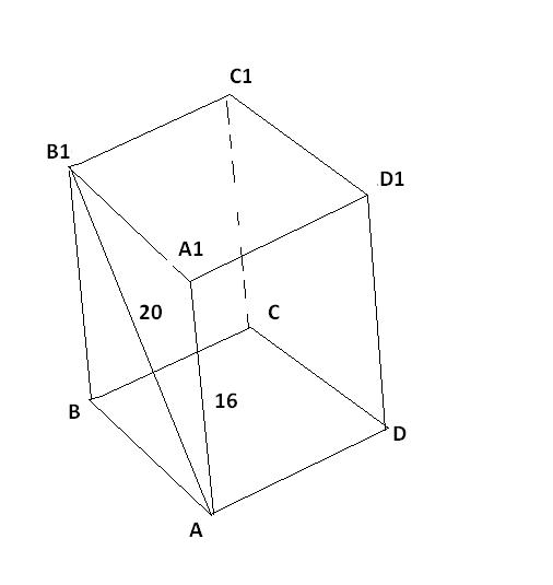 Диагональ боковой грани правильной четырехугольной призмы равна 20 см, а высота призмы равна 16 см. Найти объем призмы и площадь её полной поверхности.