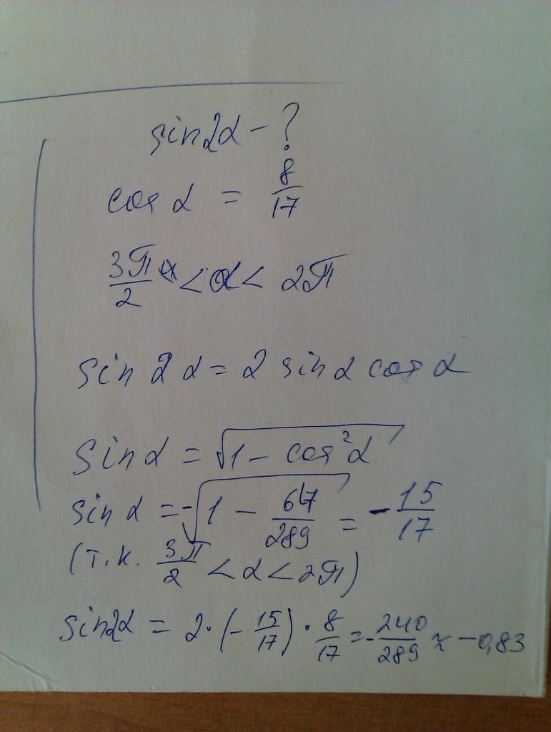 найдите sin2a если известно что cosa =8/17 и 3 пи/2 < a <2пи пожалуйста, срочно нужен ответ и и решение!!!