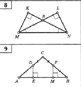 8. KRM и RLN по равным гипотенузам и углам пр вершине R(они равны как вертикальные углы). KNM и LMN. MN- общий катет, углы при M и N равны по условию.